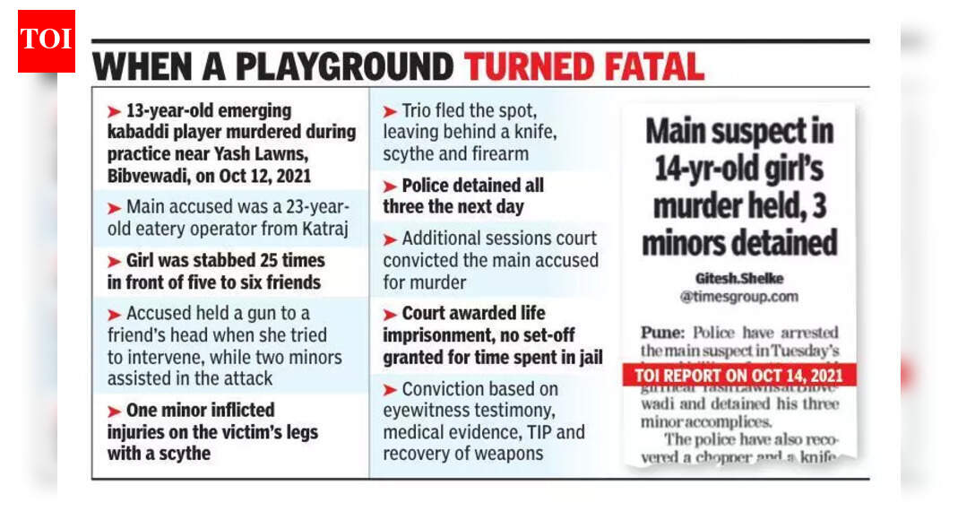 पुणे: 12 ऑक्टोबर 2021 रोजी बिबवेवाडी येथील यश लॉन्सजवळ एका 13 वर्षीय उदयोन्मुख कबड्डीपटूची निर्घृण हत्या केल्याप्रकरणी अतिरिक्त सत्र न्यायाधीश एसआर साळुंखे यांच्या न्यायालयाने मंगळवारी एका भोजनालय चालकाला दोषी ठरवून जन्मठेपेची शिक्षा सुनावली.एका मोकळ्या प्लॉटमध्ये खेळाचा सराव करत असताना अल्पवयीन मुलाच्या पाच ते सहा मित्रांच्या उपस्थितीत ही घटना घडली.कात्रज येथील मुख्य आरोपीने (गुन्हा घडला तेव्हा वय 23 वर्षे) या मुलीवर 25 वार केले ज्यामुळे तिचे डोके शरीरापासून जवळजवळ विच्छेदन झाले होते. त्याच्यासोबत दोन अल्पवयीन मुलेही होती. आरोपी हा मुलीचा दूरचा नातेवाईक होता. तिने धारदार शस्त्र हिसकावून घेण्याचा प्रयत्न केला तेव्हा त्याने तिच्या मैत्रिणीच्या डोक्यात बंदूक धरली. दोन अल्पवयीन मुलांपैकी एकाने पिडीत मुलीच्या पायाला कात्रीने वार केले. पोलिसांनी सांगितले की, मुलीच्या कुटुंबीयांनी तिच्यासोबतचे संबंध नाकारले होते.हल्ल्यानंतर तिघांनी चाकू, काच आणि बंदुक घटनास्थळी सोडून पळ काढला — जो पोलिसांनी जप्त केला. दुसऱ्या दिवशी, पोलिसांनी तिघांना ताब्यात घेतले आणि दोन अल्पवयीन मुलांना बाल न्याय कायद्यांतर्गत कायदेशीर प्रक्रियेसाठी पाठवले. मुख्य आरोपीविरुद्ध आरोपपत्र दाखल करण्यात आले.साळुंखे यांनी सांगितले की, विशेष सरकारी वकील हेमंत झंजाड यांनी सातत्यपूर्ण प्रत्यक्षदर्शी साक्षी, वैद्यकीय पुरावे आणि तपासादरम्यान मिळालेल्या पुनर्प्राप्तीद्वारे खुनाचा आरोप वाजवी संशयापलीकडे सिद्ध केला. न्यायालयाने म्हटले “… जन्मठेपेची शिक्षा या आदेशाच्या तारखेपासून चालेल.” सर्वोच्च न्यायालयाने फाशीच्या शिक्षेची योग्यता ठरवून दिलेल्या दुर्मिळ कक्षेत हे प्रकरण येत नाही, असेही न्यायालयाने नमूद केले.साळुंखे यांनी पाच पैकी तीन प्रत्यक्षदर्शींनी नोंदवलेल्या साक्षांवर तसेच चाचणी ओळख परेड (टीआयपी) ज्या दरम्यान त्यांनी तरुणाची ओळख पटवली आणि प्रत्यक्षदर्शींच्या खात्याशी सुसंगत असलेले त्याचे कबुलीजबाब यावर अवलंबून राहिले.बचाव पक्षाचे वकील यशपाल पुरोहित यांनी TOI ला सांगितले: “आम्ही दोषी आणि जन्मठेपेच्या विरोधात उच्च न्यायालयात अपील दाखल करण्याचा कायदेशीर उपाय शोधू.”न्यायाधीशांनी नमूद केले: “या प्रकरणात पाच प्रत्यक्षदर्शी साक्षीदार होते. तिघांची तपासणी करण्यात आली असून त्यांनी फिर्यादीच्या केसला पूर्ण पाठिंबा दिला आहे. अशा परिस्थितीत बाकीच्यांची तपासणी करणे गरजेचे होते का, असा प्रश्न उपस्थित होत आहे. उत्तर ‘नाही’ असे असेल. ही गुणवत्ता महत्त्वाची आहे आणि प्रमाण नाही. दुसरे म्हणजे, बाकी साक्षीदार न तपासल्याने आरोपीला कोणता पूर्वग्रह निर्माण झाला आहे, 
