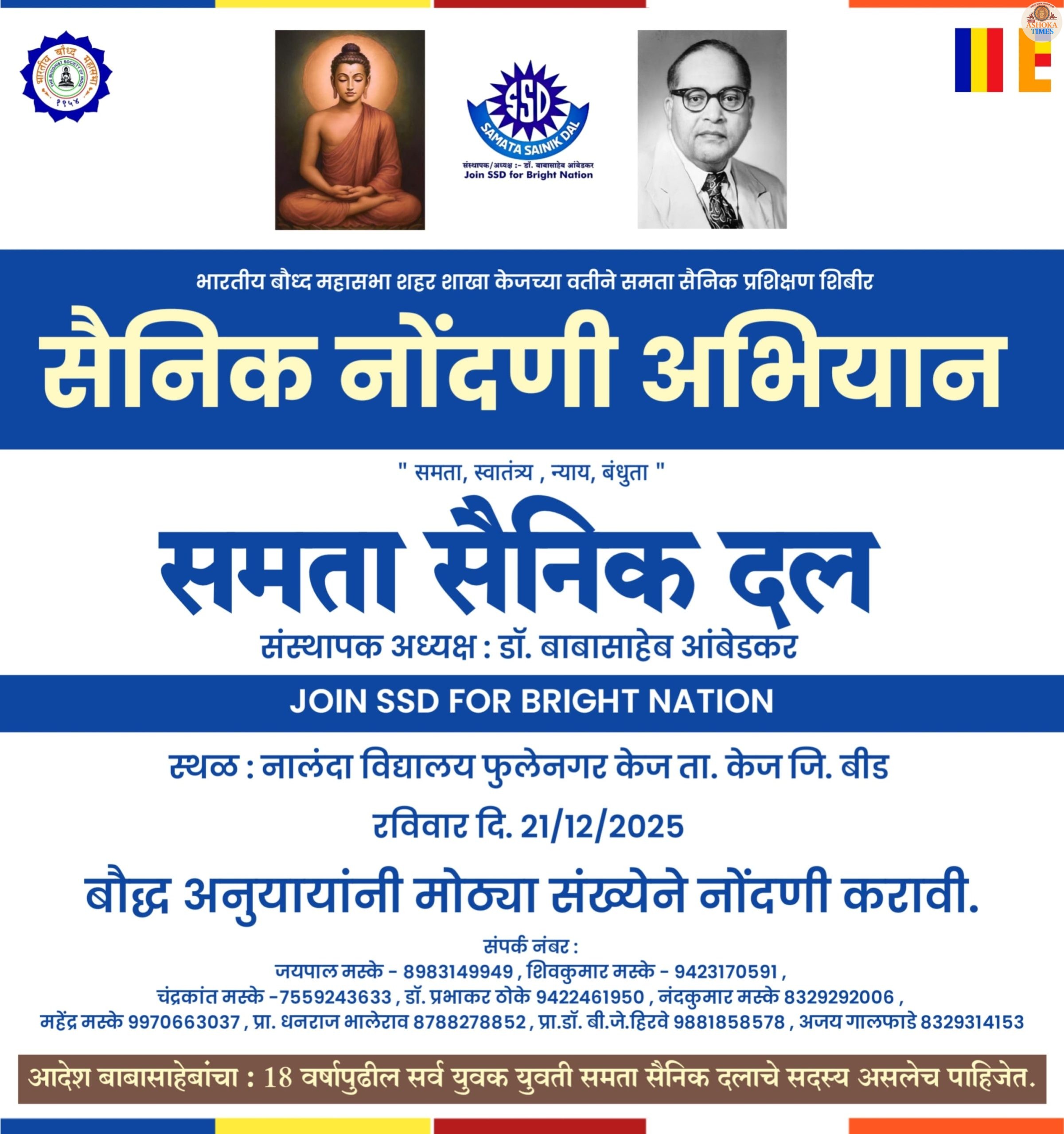 भारतरत्न डॉ. बाबासाहेब आंबेडकर यांच्या विचारांचा वारसा पुढे नेण्यासाठी आणि समाजामध्ये शिस्त व संघटनात्मक कौशल्ये वृद्धिंगत करण्यासाठी, भारतीय बौद्ध महासभा शहर शाखा केज यांच्या वतीने भव्य ‘समता सैनिक शिबिराचे’ आयोजन करण्यात आले आहे. हे शिबिर रविवार, दिनांक २१ डिसेंबर २०२५ रोजी आयोजित करण्यात आले आहे.