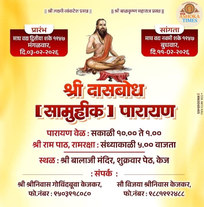 केज/प्रतिनिधी: श्री समर्थ रामदास स्वामी विरचित श्री दासबोध या ग्रंथाच्या पावन स्मरणार्थ केज शहरात श्री दासबोध [सामूहिक] पारायण सोहळ्याचे आयोजन करण्यात आले आहे.हा सोहळा माघ वद्य द्वितीया, मंगळवार दि.३ फेब्रुवारी २०२६ रोजी प्रारंभ होऊन माघ वद्य नवमी,बुधवार दि.११ फेब्रुवारी २०२६ रोजी सांगता होणार आहे.